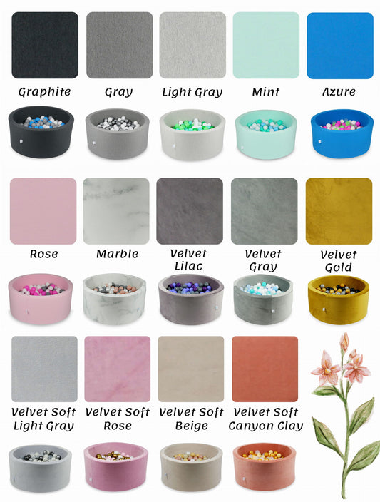 Piscine à Balles 90x40cm Velvet Soft Light Grey avec balles 300pcs (turquoise métallisé, bleu métallisé, argent, graphite métallisé, transparent, perle)