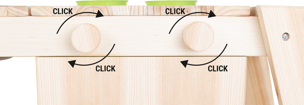 Cette cuisine de plein air invite les enfants à jouer. Un point fort est le four ! Pour l'insertion de la "plaque de cuisson", elle dispose de deux bandes prémontées. La porte du four peut être ouverte complètement en passant la main dans le trou. Un verrou magnétique assure une fermeture sûre de la porte.