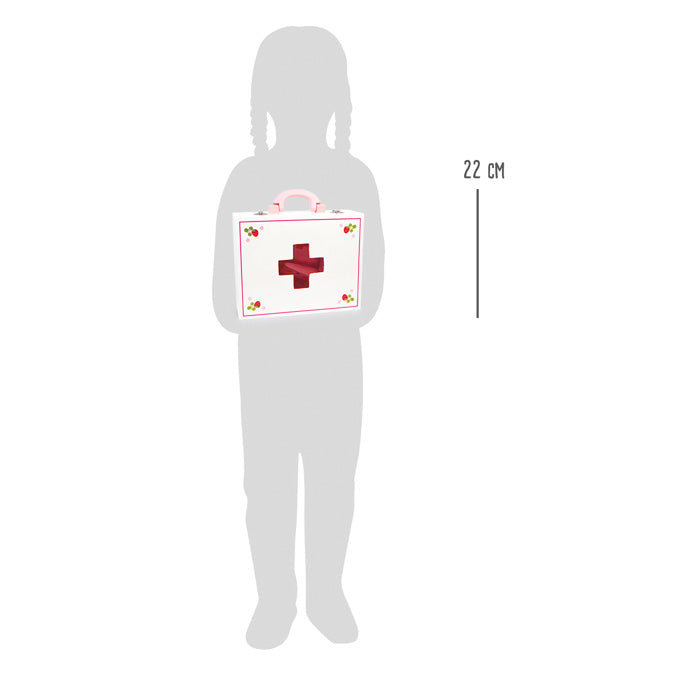 Équipée d‘un thermomètre, stéthoscope et coiffe, chaque petite infirmière peut faire sa visite dans la clinique de poupée! Avec de nombreux accessoires en bois laqué: porte-bloc avec feuilles, boîte à pilules avec 6 "plaquettes cachet", tube à crème, flacon à teinture et 6 bandes de sparadrap.