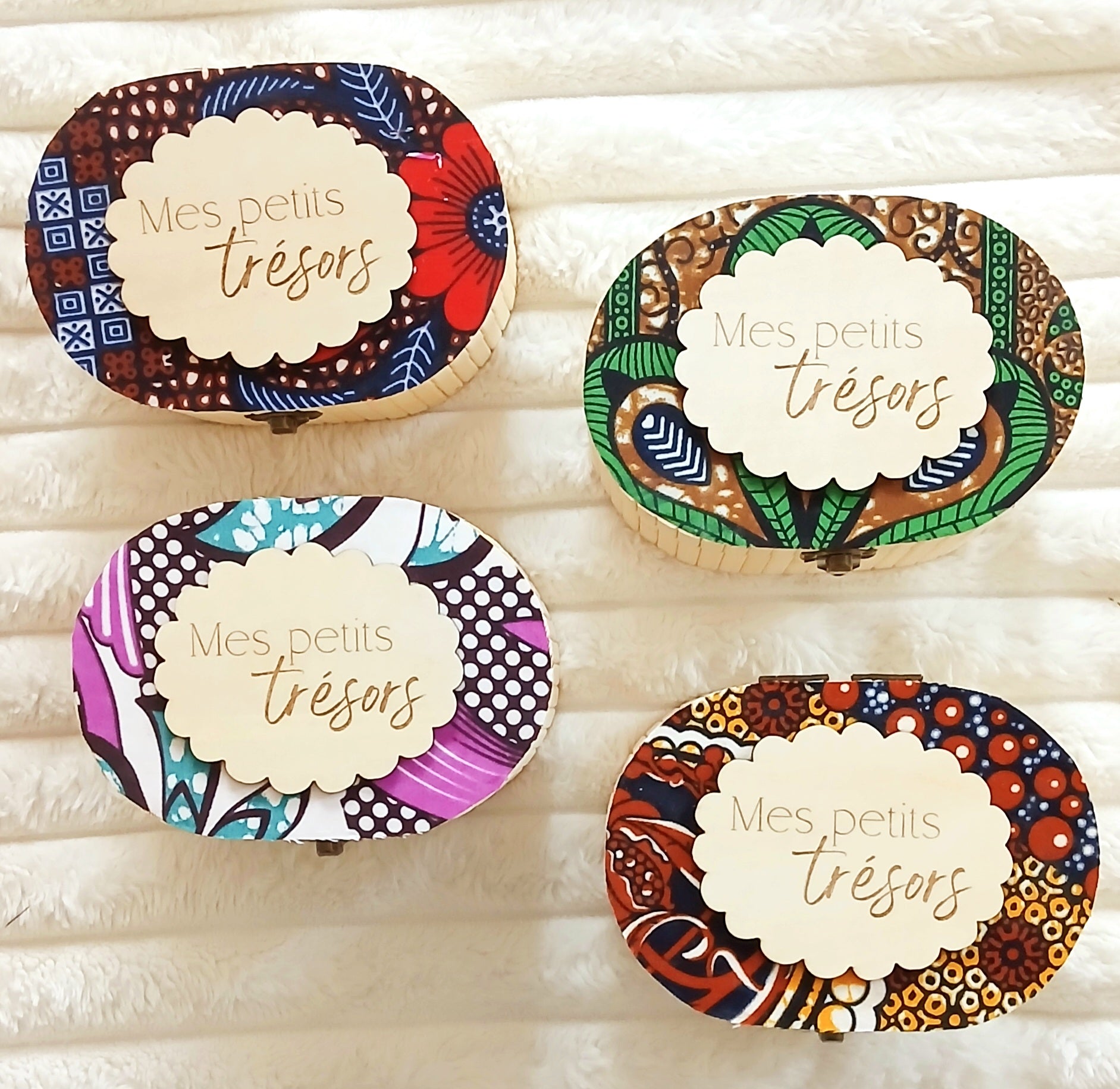 Pensée pour les enfants (et leurs parents !), cette jolie boîte en bois est recouverte d’un tissu wax coloré et décorée d’une plaque gravée “Mes petits trésors”. Elle accueillera tous les souvenirs d’enfance, secrets, cailloux magiques, bracelets d’amitié, petits mots doux ou premiers trésors ramassés au fil des jours…
