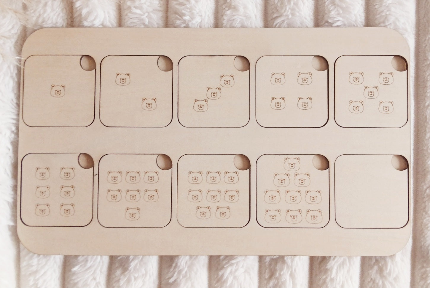 • Cartes d’association : chaque chiffre est accompagné d’une carte illustrée avec des petites têtes d'ours à compter, pour associer la quantité au chiffre.