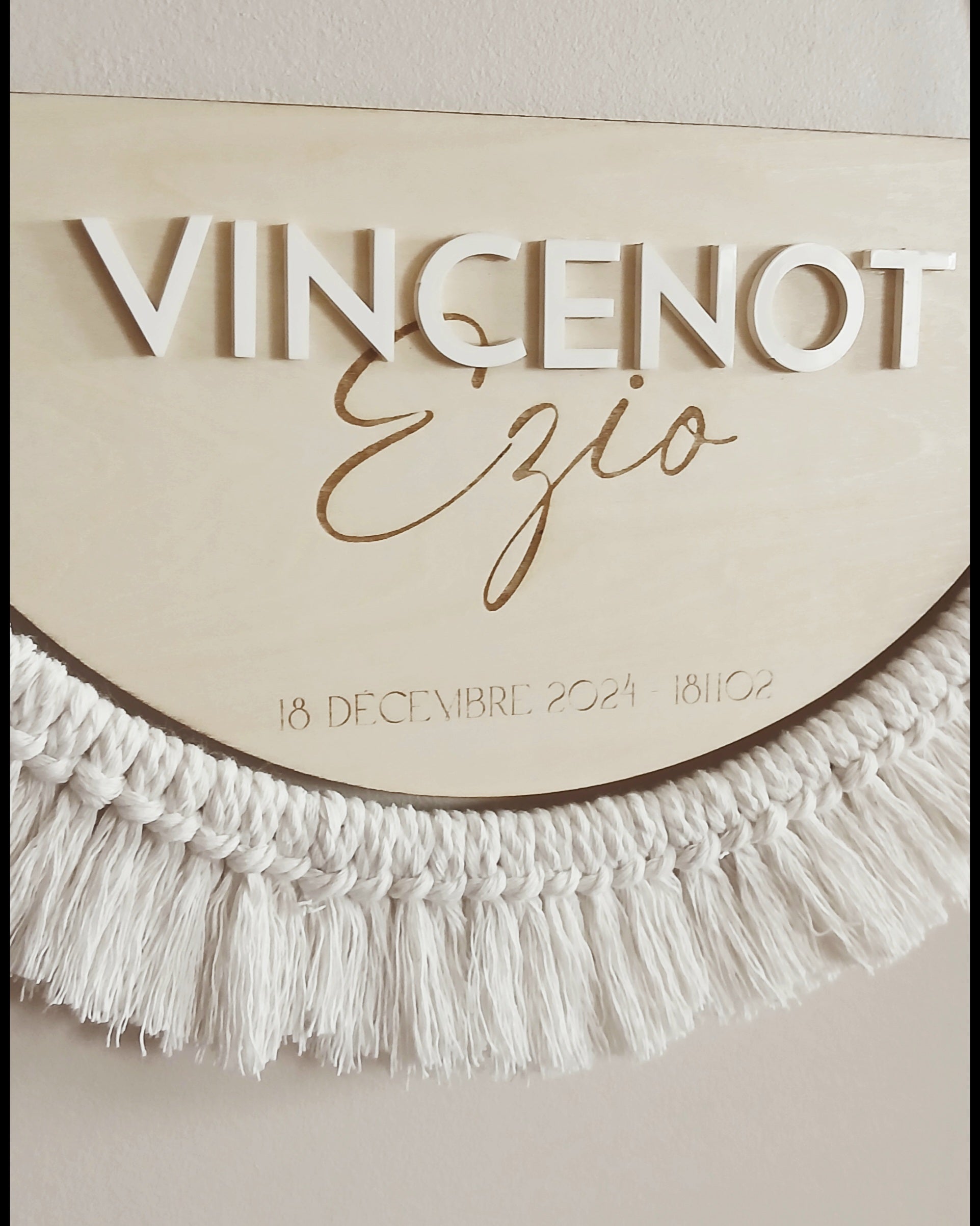 Une décoration artisanale unique pour célébrer l’arrivée d’un enfant, entièrement personnalisée et fabriquée à la main en France.