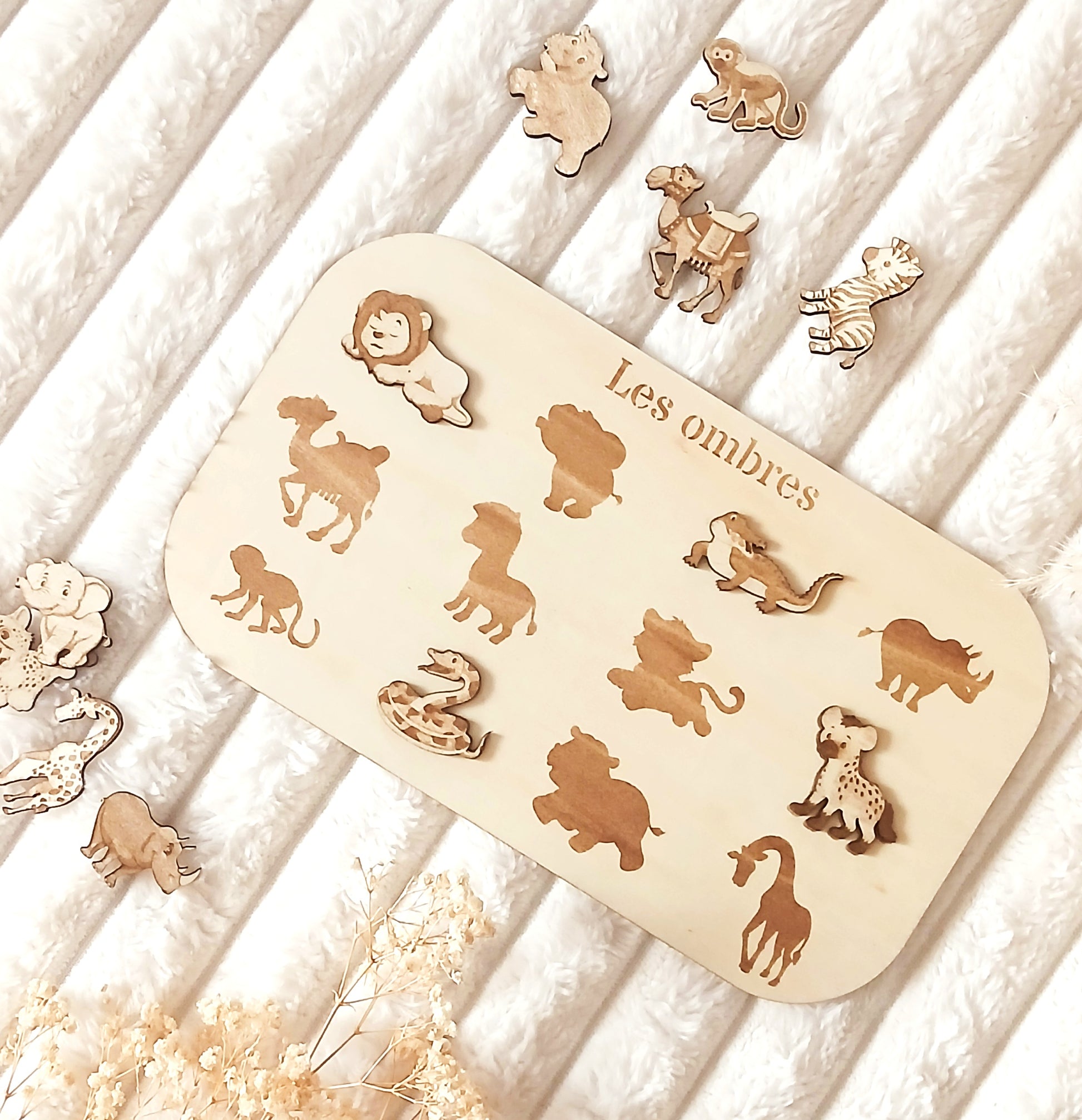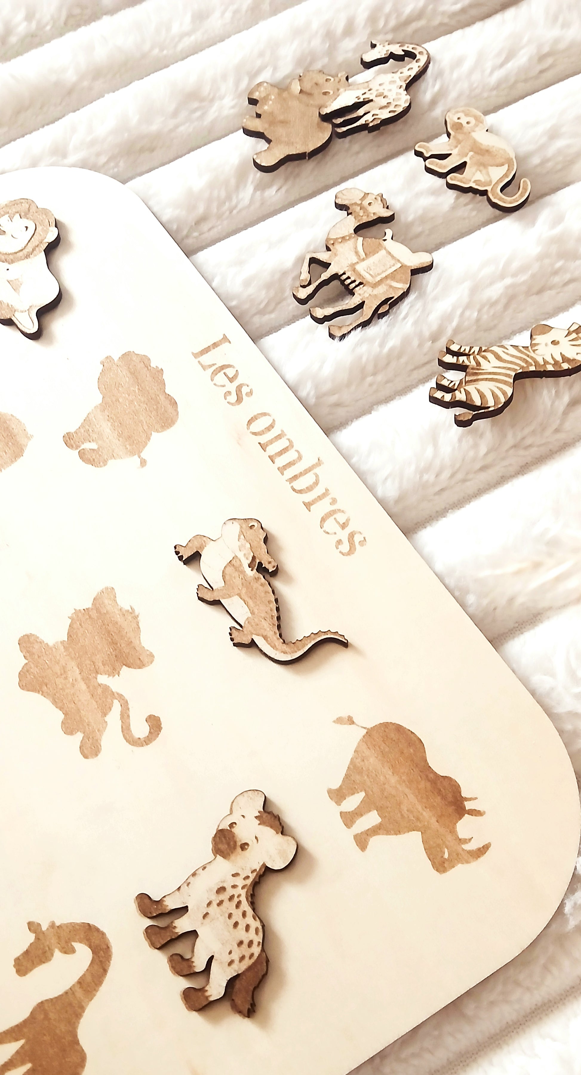 L’enfant doit associer chaque animal à l'ombre représentée sur le support en bois.