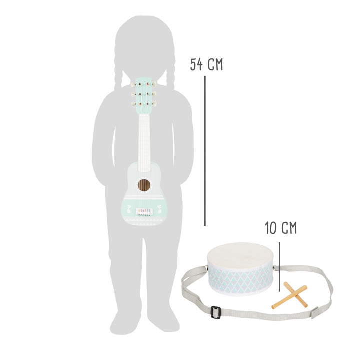 Composé d'une guitare, d'un xylophone et d'un tambour, cet ensemble transforme la chambre des enfants en une salle de concert en un rien de temps. Les trois instruments au design attrayant sont également de vrais accroches-regards. Inclus : des partitions pour guitare et xylophone !