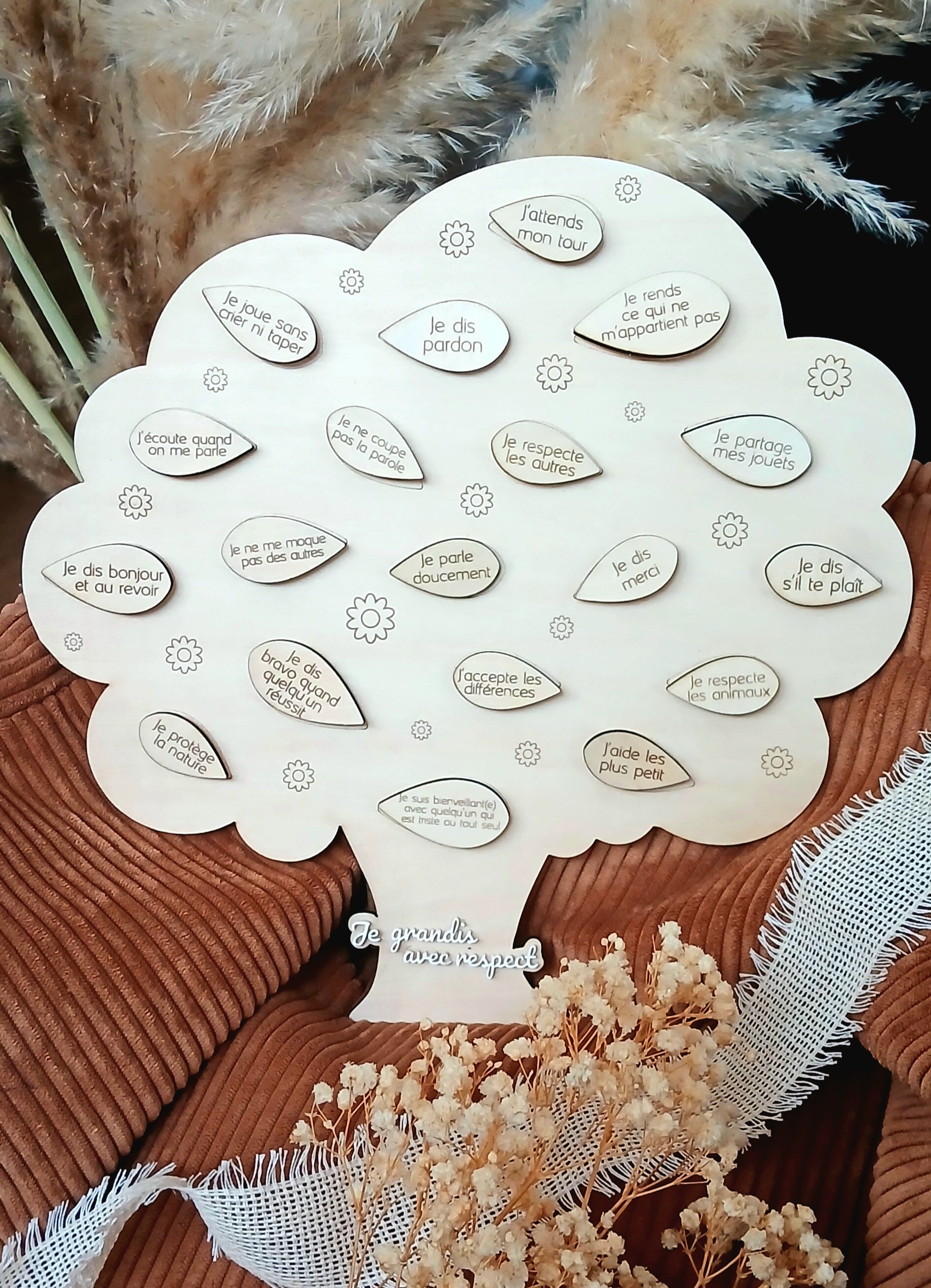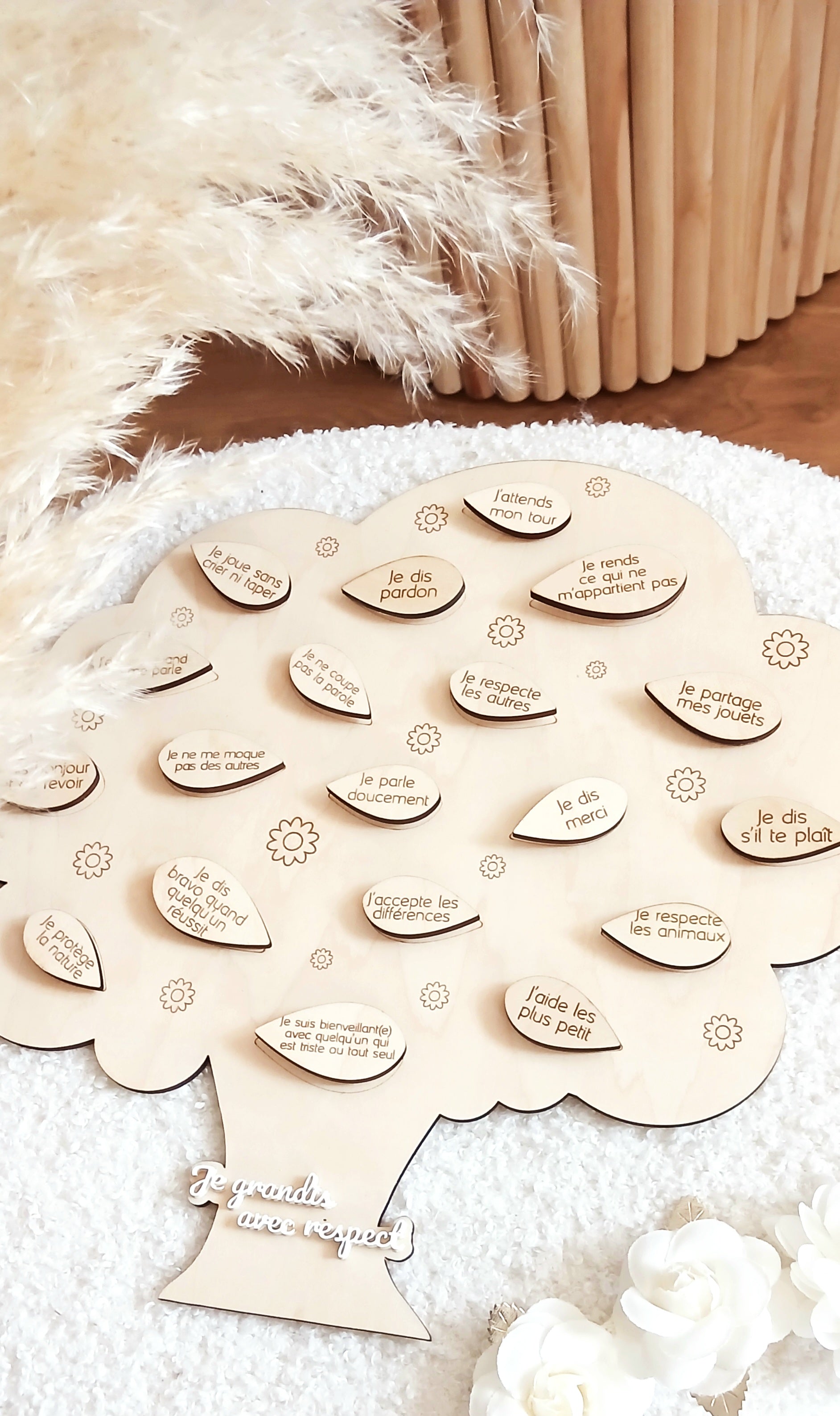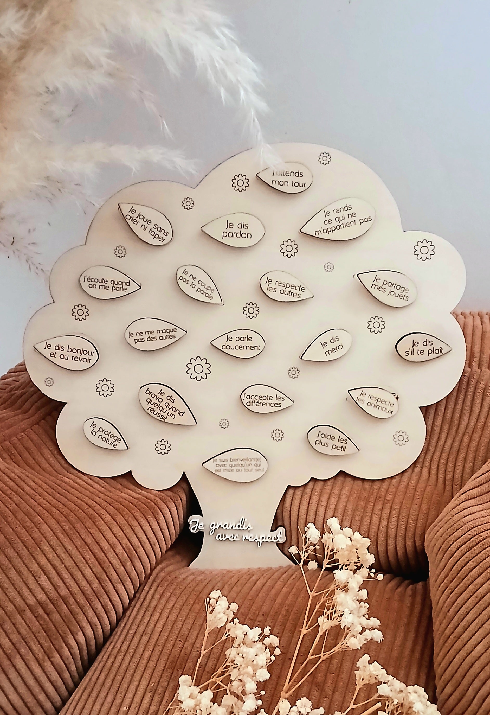 Apprenez à votre enfant les valeurs essentielles du respect de manière ludique avec notre Arbre du Respect en bois ! Dès l'âge de 3 ans, ce support éducatif l'accompagne dans la découverte des bonnes pratiques du quotidien tout en développant sa logique et sa motricité fine.