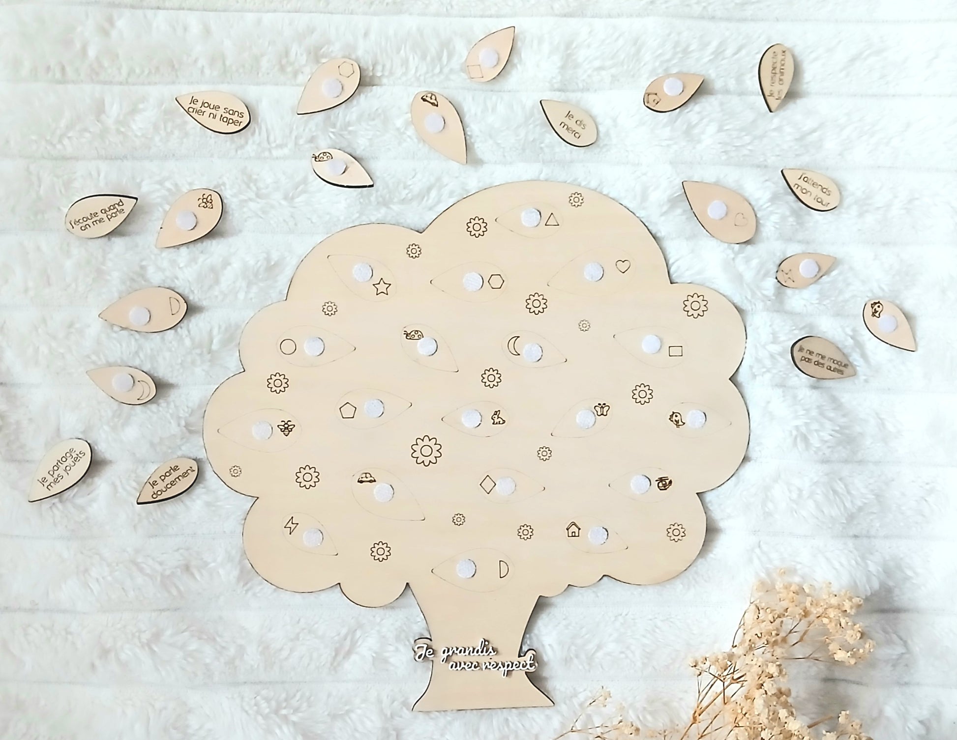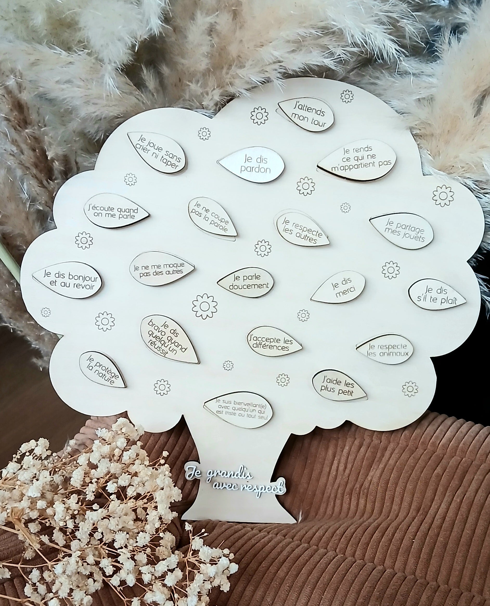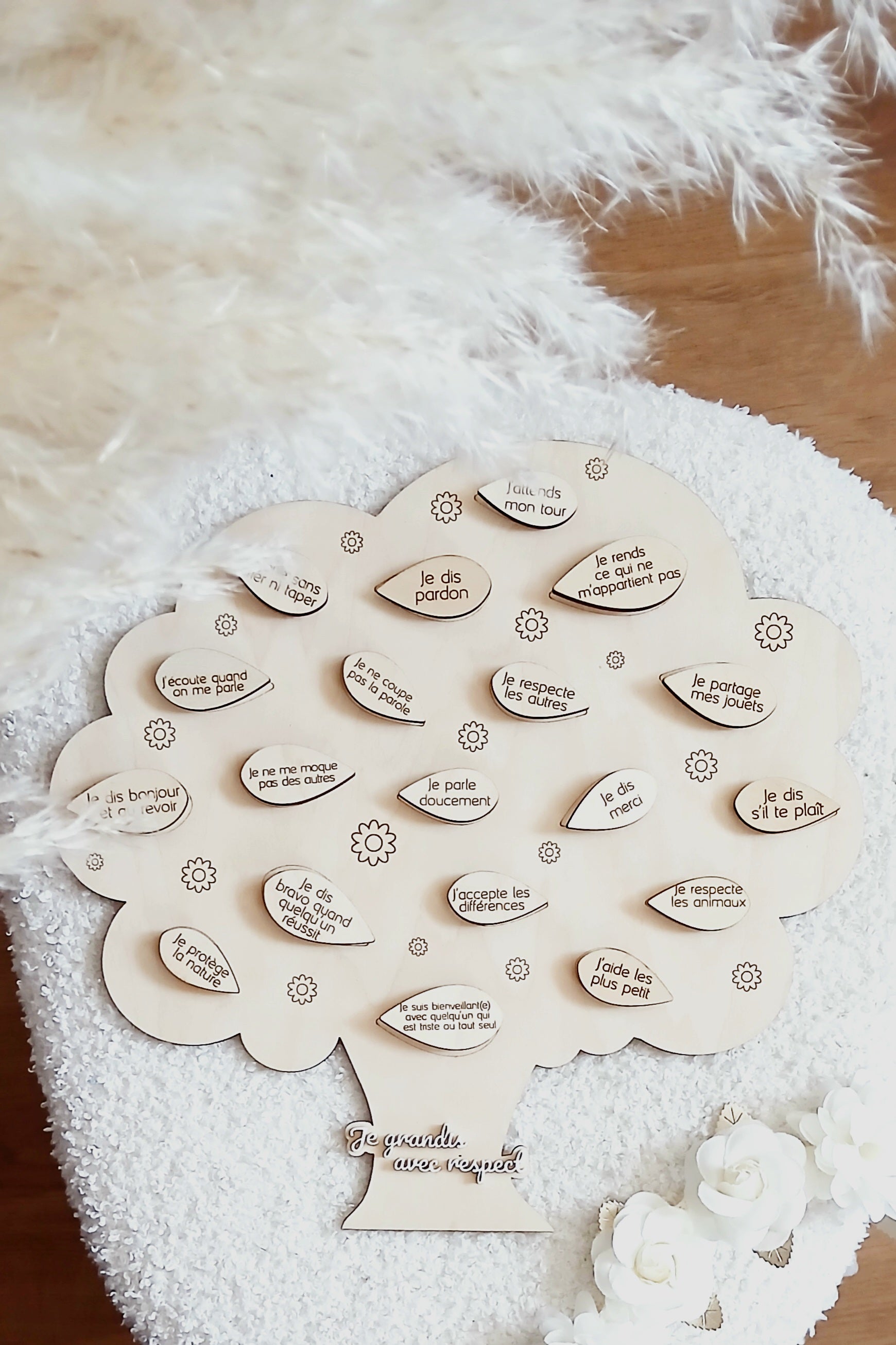 Apprenez à votre enfant les valeurs essentielles du respect de manière ludique avec notre Arbre du Respect en bois ! Dès l'âge de 3 ans, ce support éducatif l'accompagne dans la découverte des bonnes pratiques du quotidien tout en développant sa logique et sa motricité fine.