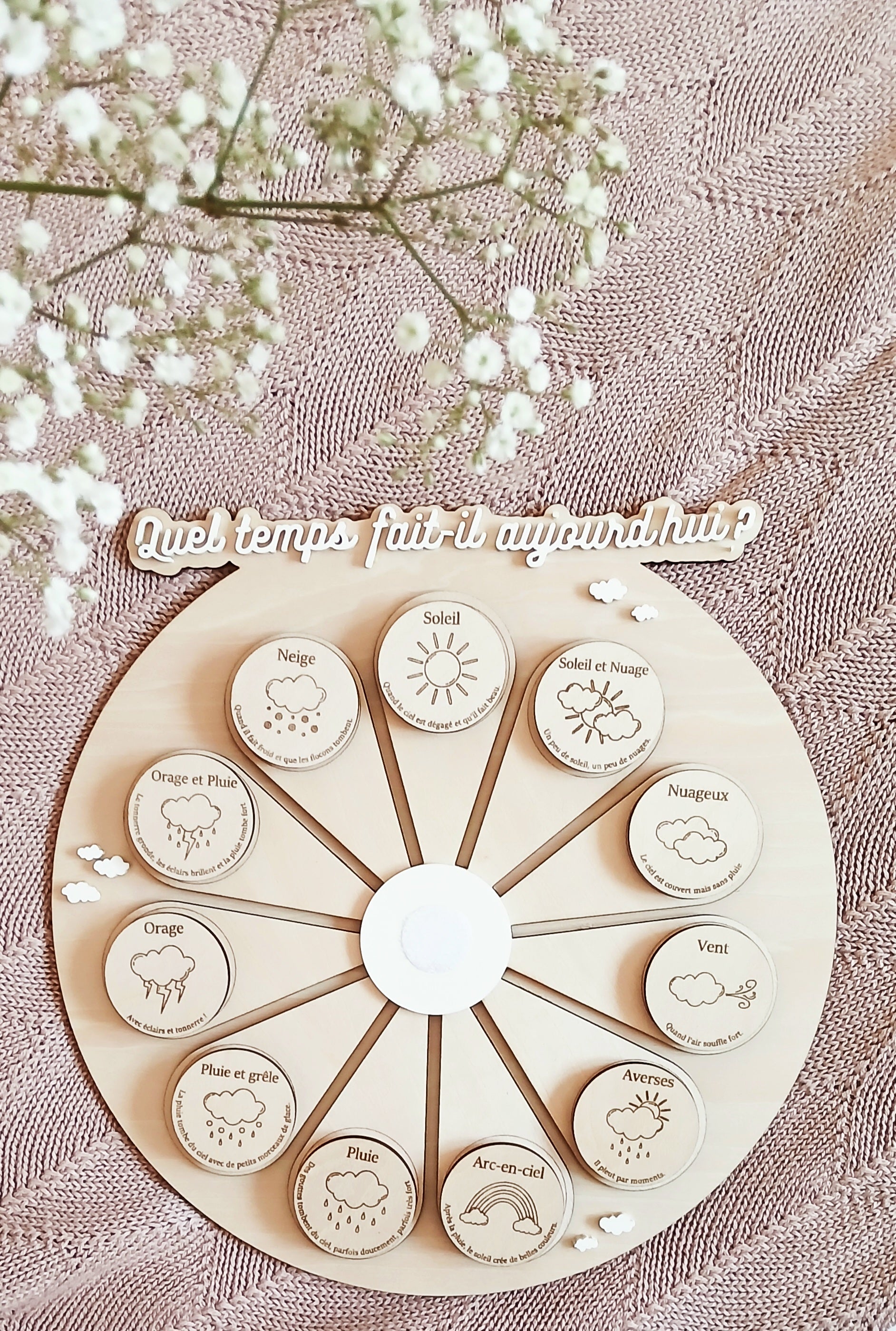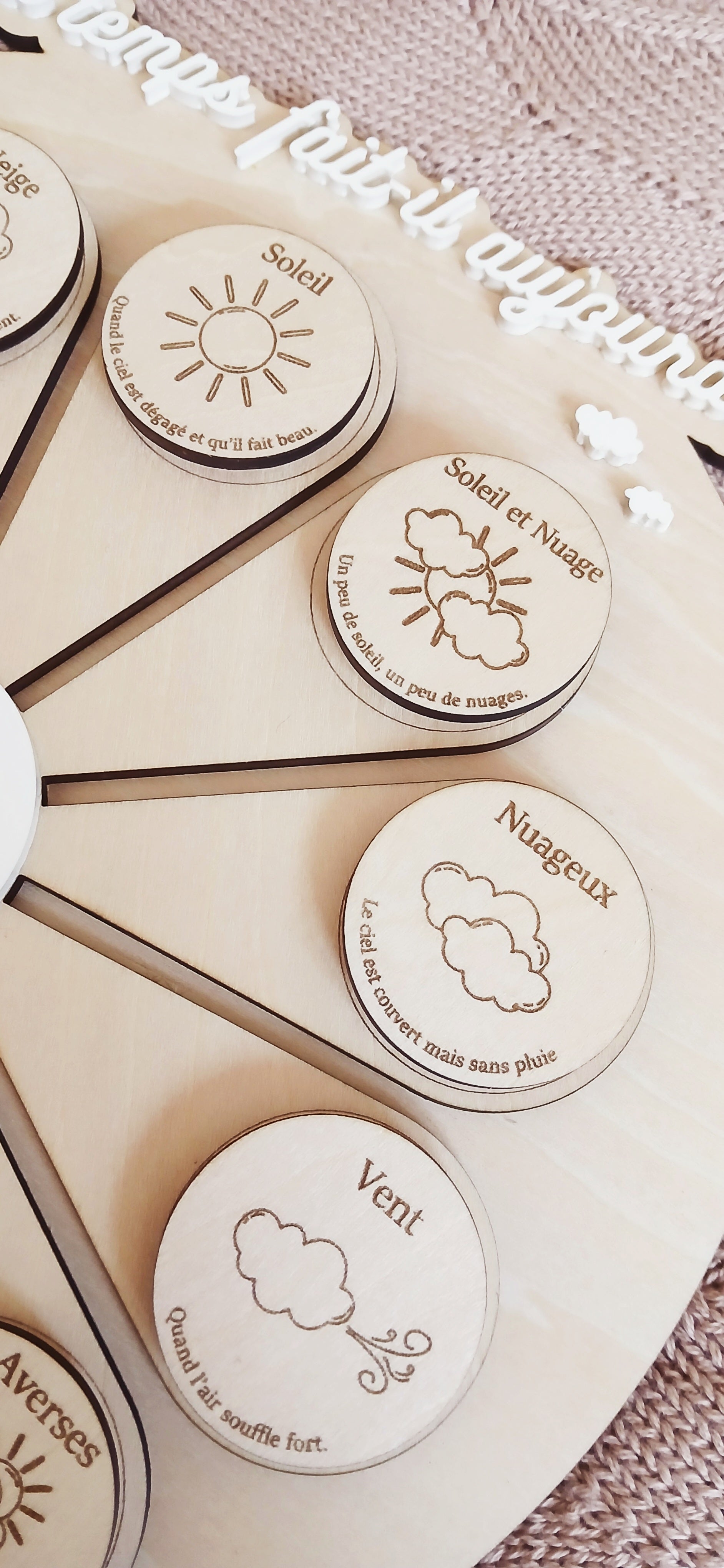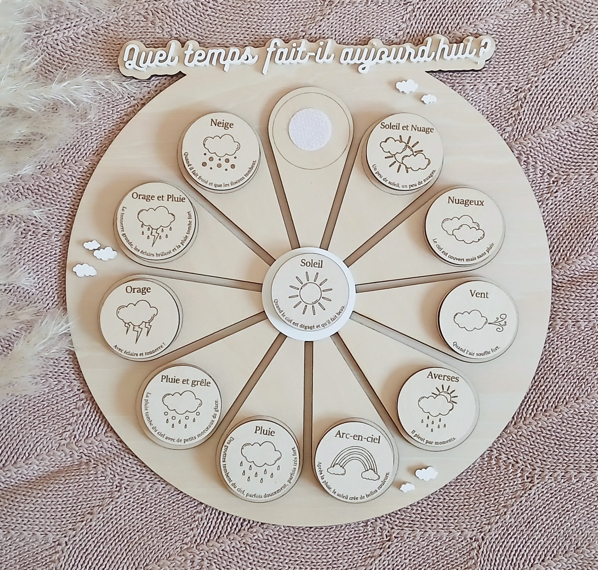 Ce cercle en bois est un support ludique et éducatif pour aider les enfants à observer et identifier la météo du jour de manière interactive. Chaque petite pastille représente un type de temps différent : soleil, pluie, neige, orage, brouillard…