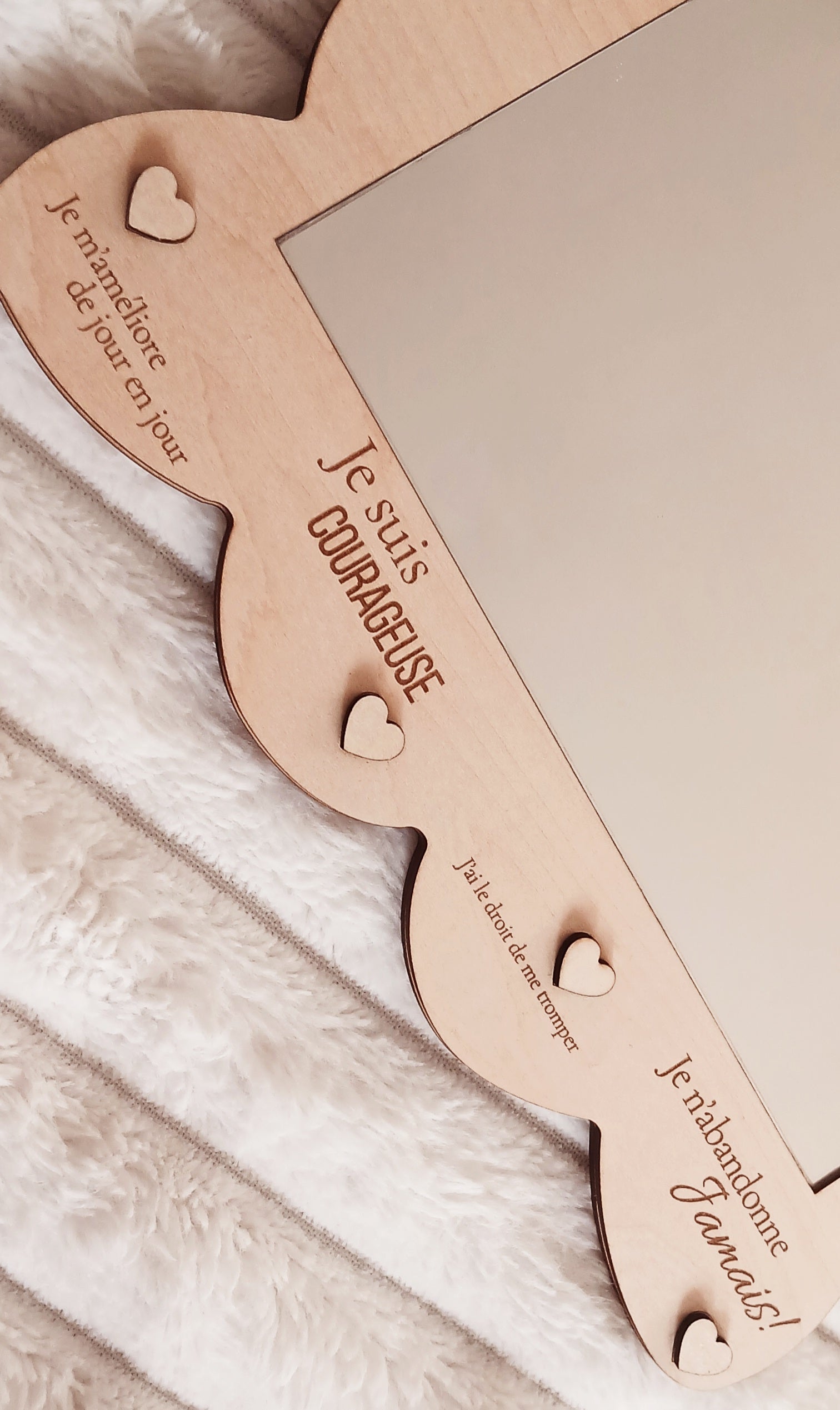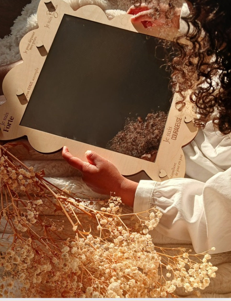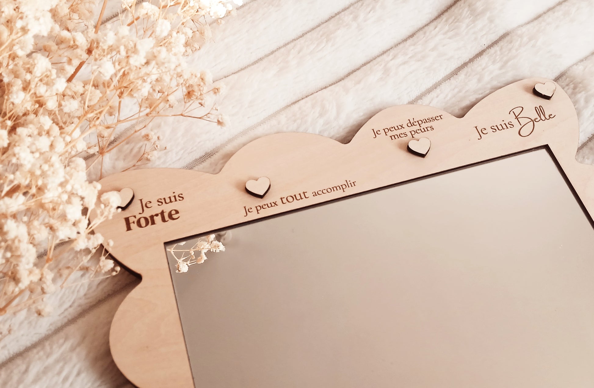 Gravé de petites affirmations positives, ce miroir devient un véritable support émotionnel, un compagnon du quotidien qui murmure à l’oreille de votre enfant :