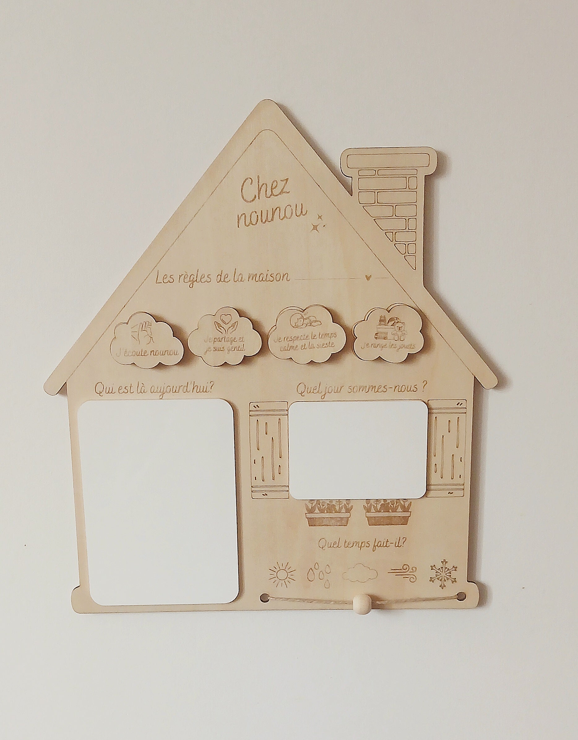 Offrez aux enfants un rituel ludique et éducatif avec le tableau Chez Nounou. Fabriqué en bois naturel, il permet d’indiquer :
